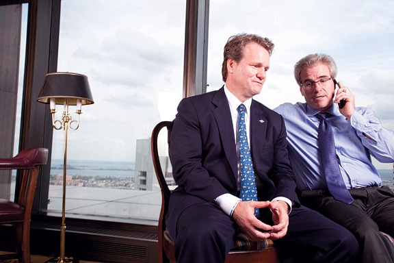 Brian Moynihan's office is perched high above the city of Boston. The floor-to-ceiling windows in his waiting room in the Bank of America building look out over the little cobblestone streets twisting below and to the Charles River just beyond, where people rowing kayaks and sculls trail little Vs of white foam behind them. The buildings of MIT are perched on the far shore, and low hills ring the city to the west.