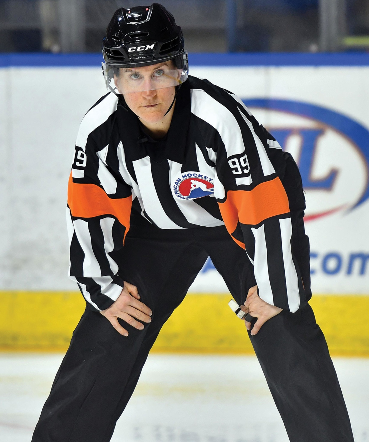 On a Saturday night last October, Katie Guay ’05 became the first woman to officiate a men’s ice hockey game in the American Hockey League—the Lehigh Valley Phantoms vs. the Wilkes-Barre/Scranton Penguins. She was the first of ten women (seven referees and three linesmen) to work on the ice during the 2021-22 season of the AHL, the primary development league for the NHL. After playing as a forward at Brown—team captain her senior year—Guay began refereeing part-time at her local rink. Since then she’s officiated women’s games at eight International Ice Hockey Federation tournaments, including at the 2018 Winter Olympics in PyeongChang, South Korea, and she was the first woman (in 2015) to officiate an NCAA Division I men’s hockey game. “My one goal had always been the Olympics,” she said last fall in the Globe and Mail, “so I thought I had already reached the pinnacle for my officiating, but then this new opportunity opened up to continue the journey.”