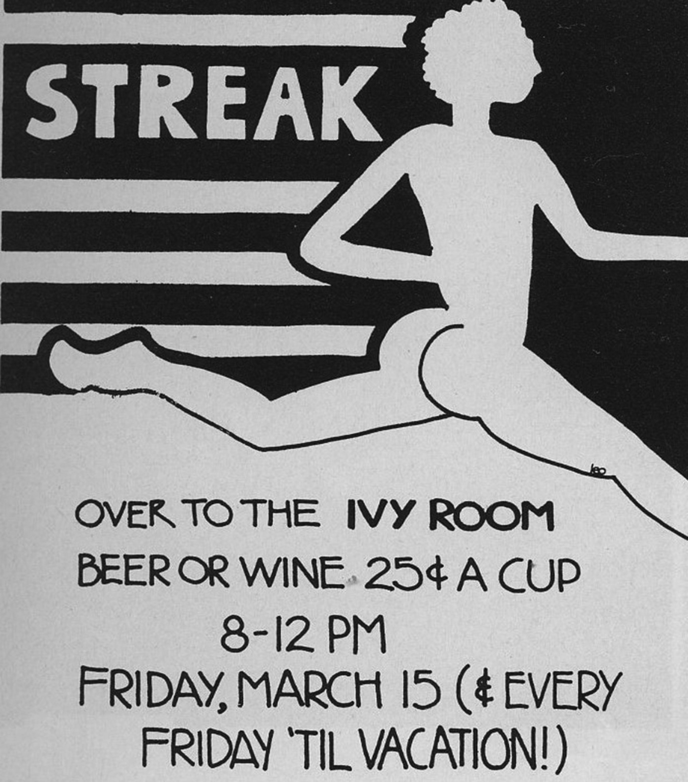 The rest of the campus was quick to pick up on the new craze. A “Streakers Ball,” featuring free admission for streakers, was planned for mid-March, but was cancelled when University officials insisted that extra security guards and local policemen be hired at the expense of the ball’s organizers. Even Joe’s sandwich shop on Benefit Street has gotten into the act. They have a new sandwich called “The Streaker”—it’s tuna on rye and takes on ten seconds to make.